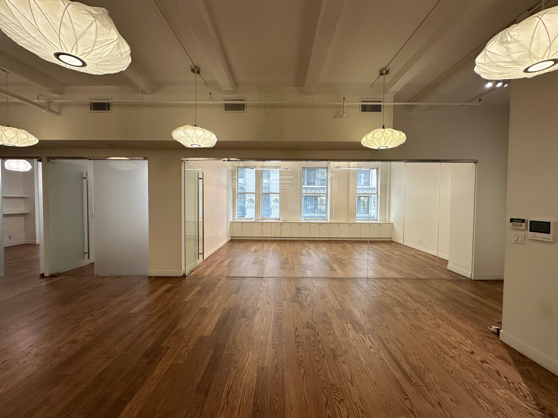 Full floor with glass front conference room and offices, full pantry, tenant controlled A/C, 12' ceilings, hardwood floors, large built-in desking, perfect for architects or engineers.
